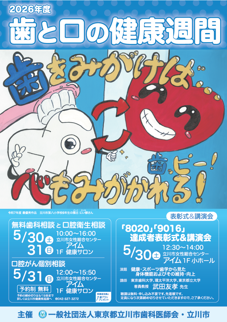 立川市歯科医師会ではこの期間に併せ、無料の歯科健診・口腔衛生相談、口腔がん個別相談、ならびに「8020」「9016」達成者表彰式&特別講演会「おいしく、楽しく、美しく 接触機能の実力」を実施します。
